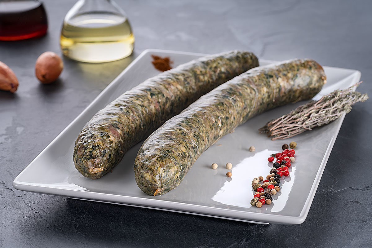 Nos saucisses d’herbes sont composées d’un assortiment de maigre, gras et couenne cuite de porc, haché gros puis embossé dans un boyau naturel. La couenne donne un moelleux unique à nos saucisses savamment parfumées d’épices.